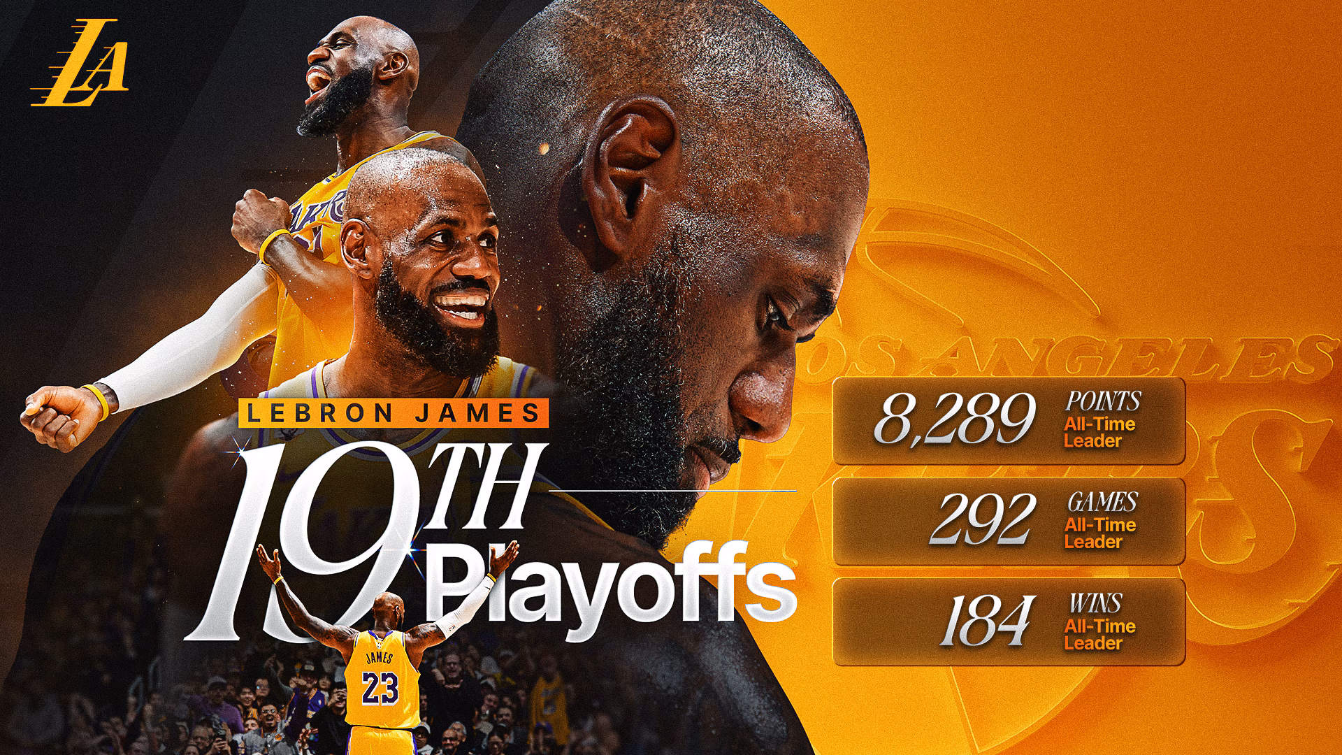 James cùng với Karl Malone và John Stockton có số trận playoff nhiều nhất trong lịch sử NBA, đồng thời vượt qua Kareem Abdul-Jabbar và Tim Duncan, mỗi người có 18 lần. Của anh ấy 19 Số lần xuất hiện ở trận playoff nhiều hơn sáu Nhượng quyền thương mại NBA có toàn bộ lịch sử của họ: Orlando (18), Memphis (14), Minnesota (14), Toronto (14), Charlotte (10) và New Orleans (9).
